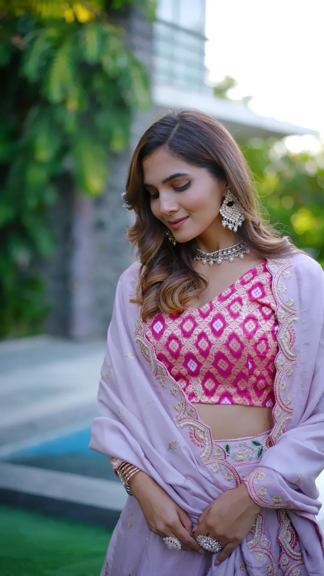 Lavender Viscose Lehenga with Pink Banarasi Blouse and Embroidered Dupatta