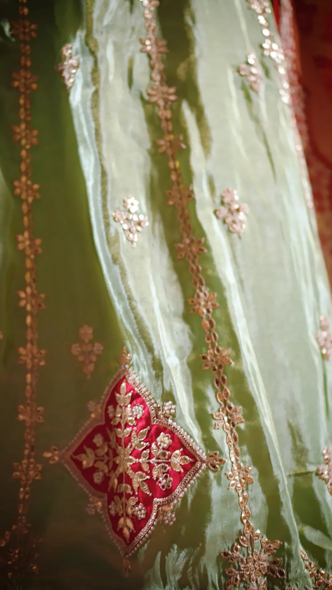 Design Appeal Pastel Mint Base with Vibrant Red Banarasi Dupatta — Classic and Striking Combination