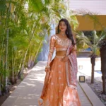 Peach Embroidered Designer Lehenga Choli with Red Bandhani Dupatta