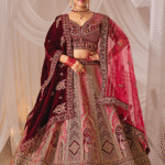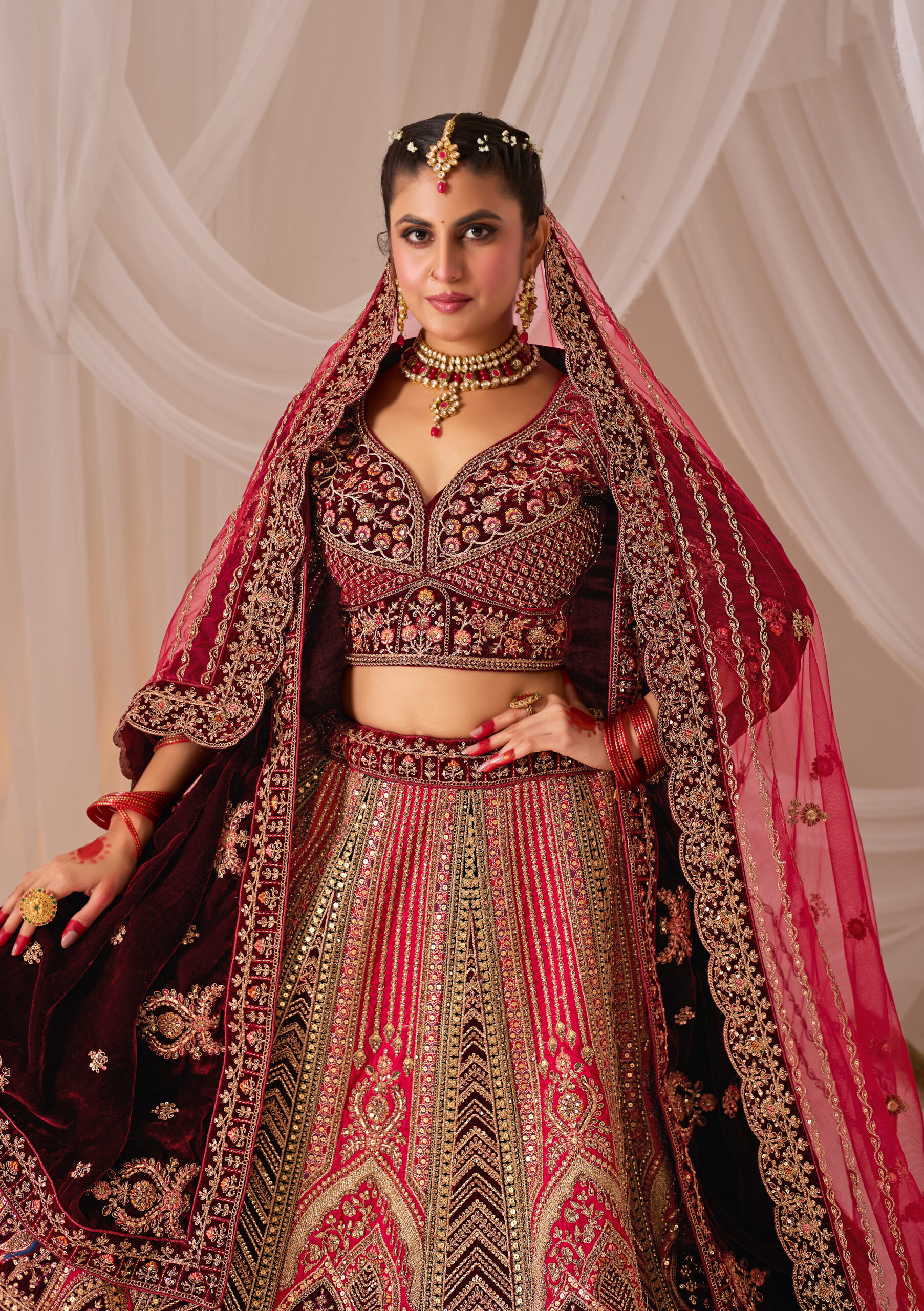 Wine & Pink Heavy Embroidered Bridal Lehenga with Velvet Dupatta